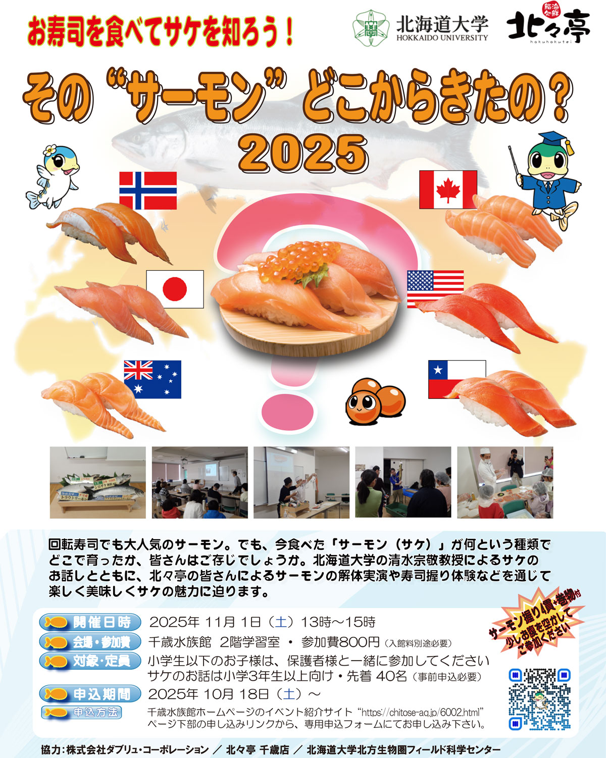 内容 | 回転寿司でも大人気の「サーモン」。でも、今食べた「サーモン(サケ)」は何という種類でどこで育ったのでしょうか。北海道大学の清水宗敬教授によるサケのお話しとともに、回転寿司の北々亭の皆さまによるサーモンの解体実演や寿司握り体験、そして食べ比べなどを通じて、楽しく美味しくサケの魅力と不思議に迫ります。 協 力:株式会社ダブリュ・コーポレーション / 北々亭 千歳店