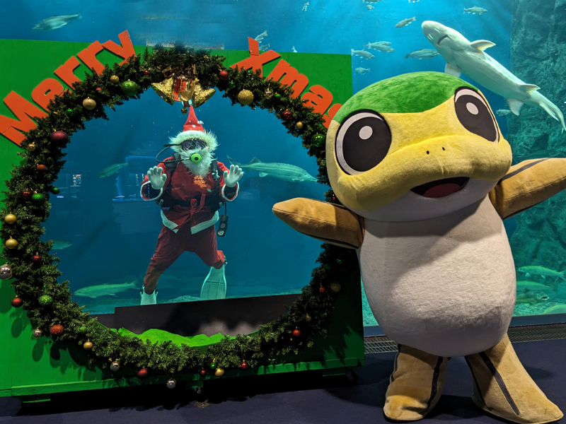 水槽にサンタダイバーが登場!!撮影の時は、当館のマスコットキャラクター「サモンくん」も一緒。思い出の一枚を撮影しよう!