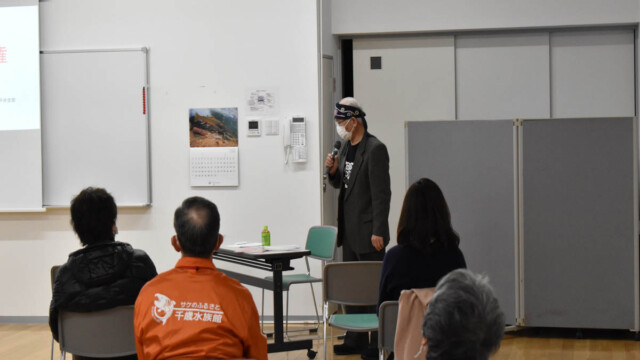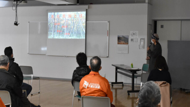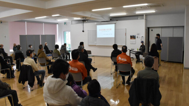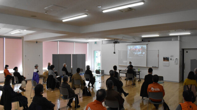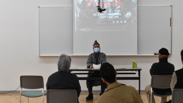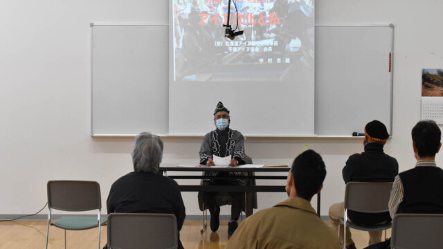 この「千歳アイヌのサケ文化」展示リニューアルを記念して、2021年2月27日には千歳アイヌ文化伝承保存会 副会長の平井史郎氏による「先住民族と先住権」、28日は公益社団法⼈北海道アイヌ協会 副理事⻑であり、千歳アイヌ協会 会⻑の中村吉雄 氏による「アイヌ文化と私」をテーマとした記念講演会を開催いたしました。どちらの講演も定員30名を若干上回る参加があり、会場となった2階学習室は満員の状態で、予定時間の50分を超える活発な質疑応答が行われました。