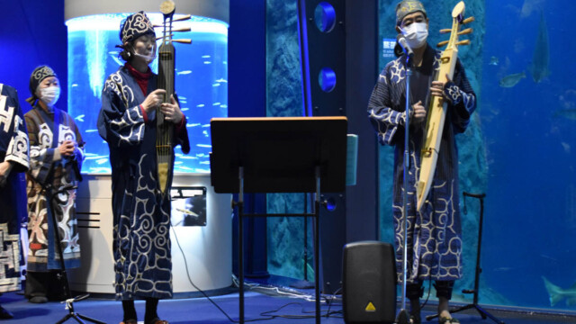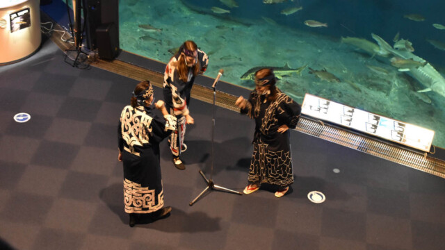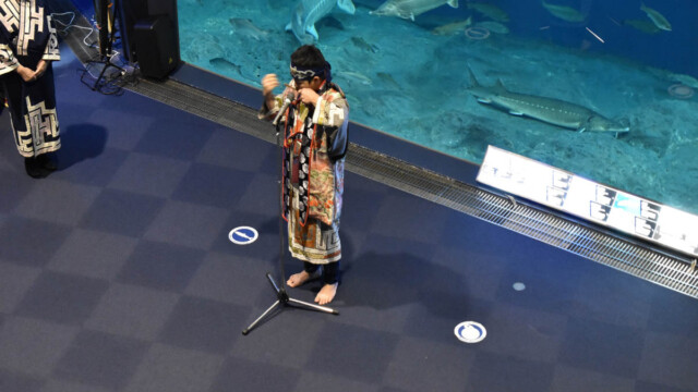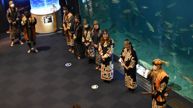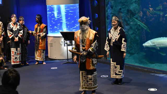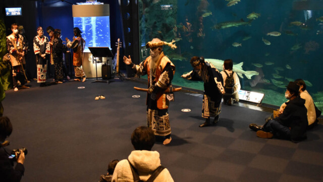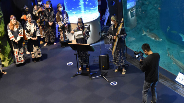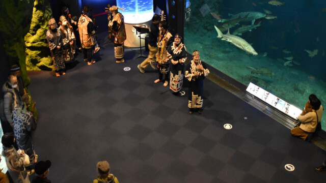 また、講演会の後には両日とも、水族館1階大水槽前にておよそ50分にわたり、アイヌの古式舞踊や歌謡、伝統楽器の演奏などが披露され、途中大水槽のエサやりタイムなどもはさみながら、来館された多くのお客様に楽しんでいただきました。